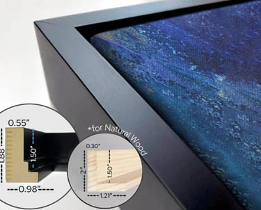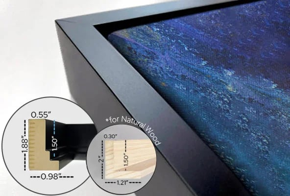 This option features a thick, archival-grade polycotton-mix canvas that is carefully hand-stretched over solid wood stretcher bars, then attached to a wood floater frame. Frame color is black.